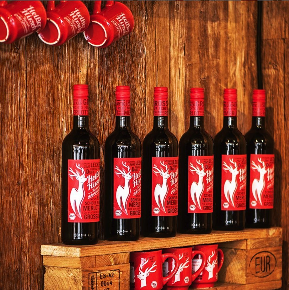 Inhalt: 6 Flaschen HEISSER HIRSCH roter Qualitätsglühwein (bio, vegan) á 0,75 l, Allergene: Enthält Sulfite, pfandfrei, DE-ÖKO-007