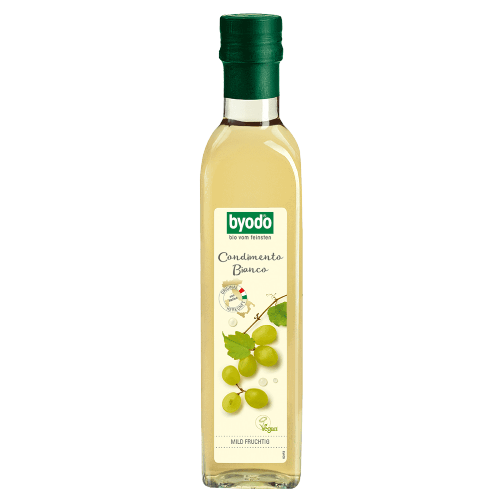 Die Gewinnung des umweltfreundlichen Byodo Essigs erfolgt grundsätzlich aus Alkohol, das heißt, abhängig von der Sorte aus Rotwein, Himbeerwein, Getreidealkohol, etc.. Der Alkohol wird in groß angelegte Gärbehälter gefüllt und unter Einsatz von Essigbakterien sowie Sauerstoffzufuhr bei Temperaturen von etwa 25 °C allmählich zu Essig vergoren. Experten bezeichnen diesen Vorgang als fortlaufende Prozedur. Die unverwechselbare Süße des klaren Balsams resultiert aus einem speziellen Verhältnis von Weißweinessig und konzentriertem Traubenmost. Sämtliche Rohstoffe stammen zu 100% aus biologischem Anbau.
