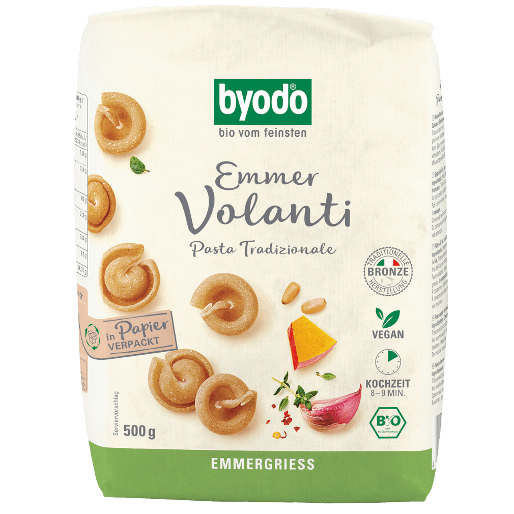 Die BYODO Emmer Volanti werden aus Bio-Emmer, einer ursprünglichen Weizensorte, hergestellt, die reich an Mineralien und Ballaststoffen ist. Die besondere Verarbeitung sorgt für eine leicht nussige Note und eine feine Bissfestigkeit – ideal für Genießer, die Abwechslung zu herkömmlicher Pasta suchen.