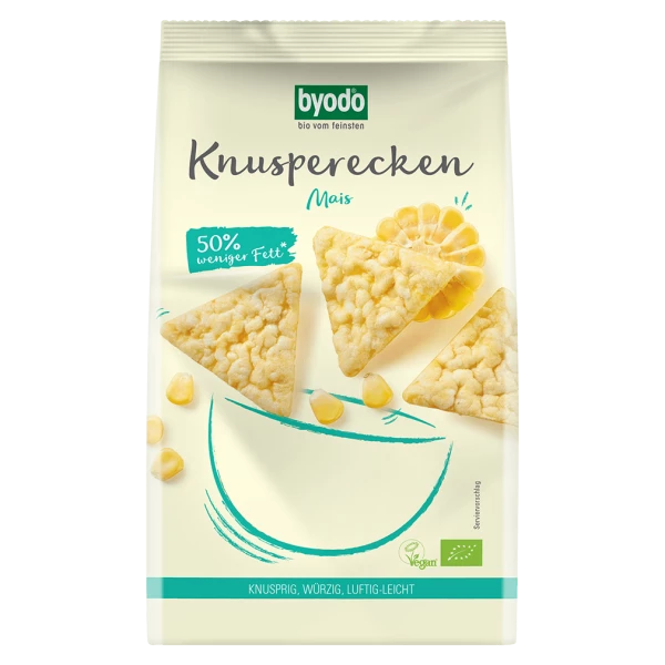 Die BYODO Knusperecken bestehen aus 100 % Bio-Mais und sind ohne künstliche Zusätze, Aromen oder Zuckerzusätze hergestellt. Sie sind fettarm und bieten einen leichten, knusprigen Snack für gesundheitsbewusste Genießer.