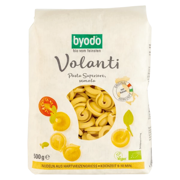Die BYODO Volanti Semola wird aus hochwertigem Bio-Hartweizengrieß hergestellt, was ihr eine angenehme Bissfestigkeit und einen milden, weizenartigen Geschmack verleiht. Die spezielle, gewellte Form der Volanti nimmt Saucen besonders gut auf und macht jedes Gericht zu einem Genuss.