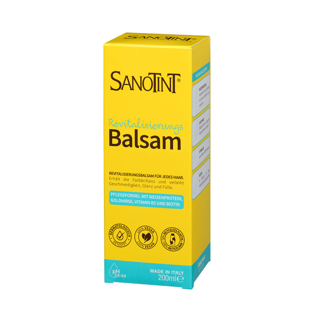 Der SANOTINT Revitalisierungsbalsam wurde speziell entwickelt, um gefärbtes Haar zu pflegen und die Farbintensität über Wochen hinweg zu erhalten. Angereichert mit Goldhirse-Extrakt, der reich an Kieselsäure, Vitaminen und Mineralstoffen ist, stärkt er die Haarstruktur und verleiht dem Haar gesunden Glanz. Zusätzlich fördern die enthaltenen Vitamine B5 und Biotin die Gesundheit des Haares.