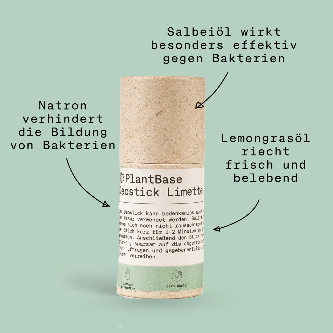 Cocos nucifera oil (Kokosöl), Butyrospermum parkii (Sheabutter), Sodium (Natron), Bicarbonate, Zea Mays (Corn) Starch, Copernicia carifera (Carnauba) Wax, Melaleuca alternifolia leaf oil (Teebaumöl), Citrus aurantifolia oil (Limettenöl)