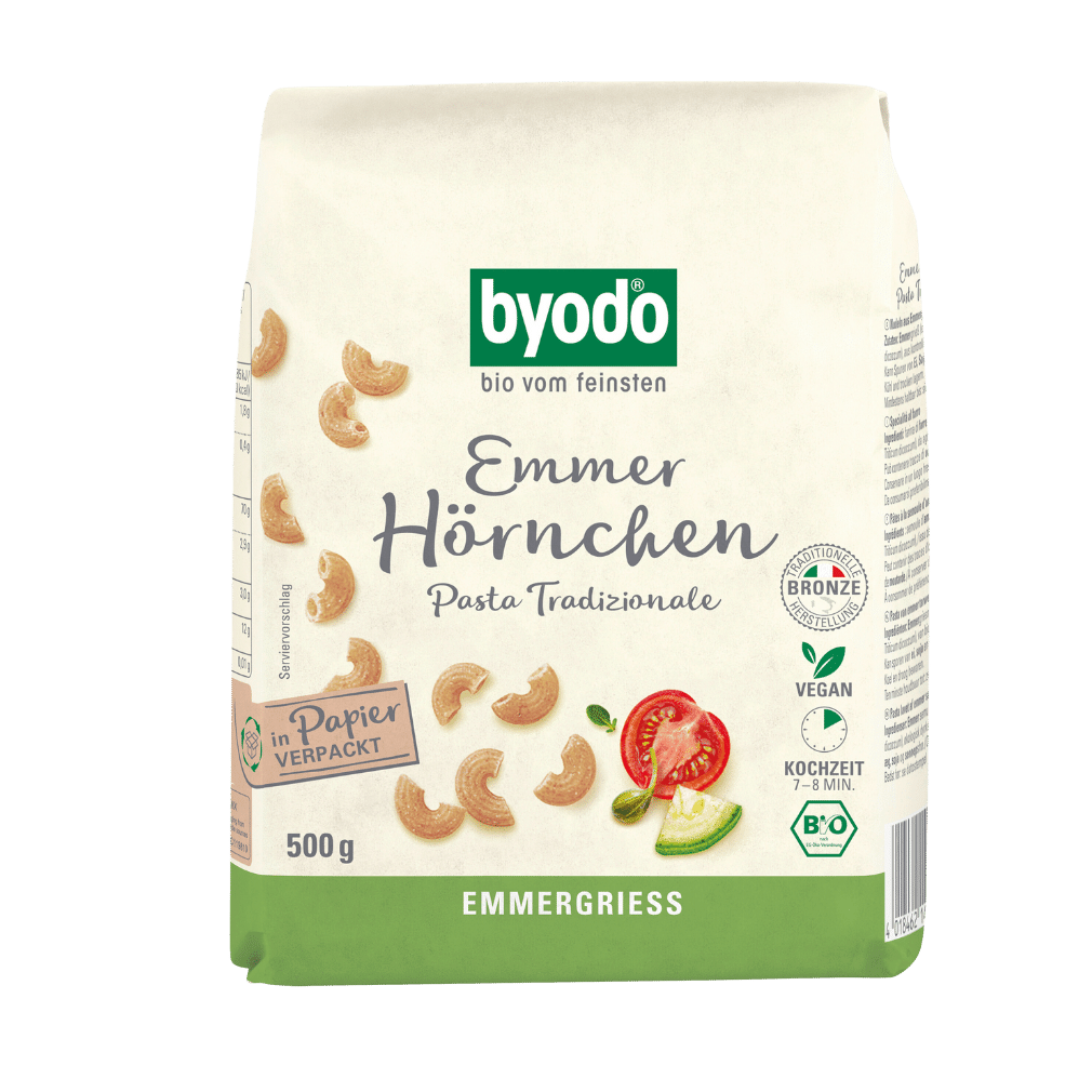 Die BYODO Emmer Hörnchen werden aus dem Urgetreide Emmer, auch als Sommerdinkel bekannt, hergestellt. Dieses hochwertige Getreide wird sorgfältig verarbeitet, um den nussigen Geschmack und die wertvollen Inhaltsstoffe wie Ballaststoffe und Mineralstoffe zu bewahren. Die traditionelle Fertigung sorgt für eine Pasta mit optimaler Konsistenz und hervorragender Saucenbindung.