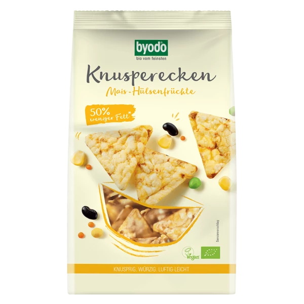 Die würzigen Byodo Knusperecken Mais-Hülsenfrüchte sind eine luftig-leichte Alternative zu klassischen Chips. Diese knusprigen Ecken bestehen aus italienischem Bio-Mais und einer Mischung aus gelben und grünen Erbsen, roten Linsen und schwarzen Bohnen. Sie werden ohne Frittieren locker gepufft und anschließend nur mit etwas Salz und wertvollem Maiskeimöl besprüht.