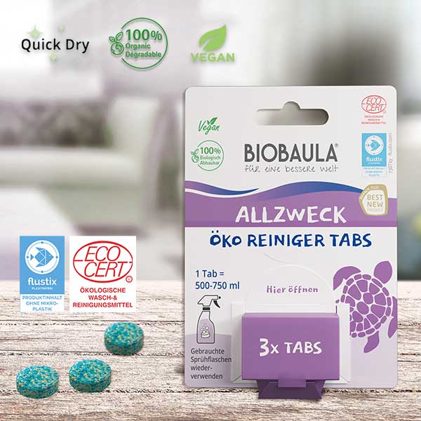 Bei BIOBAULA kaufen Sie nur die Reinigungs-Tabs und erhalten durch hinzufügen von Wasser ein vollwertiges Reinigungsmittel. Zudem sind alle BAULA-TABS zu 100% biologisch abbaubar und ökologisch einwandfrei.