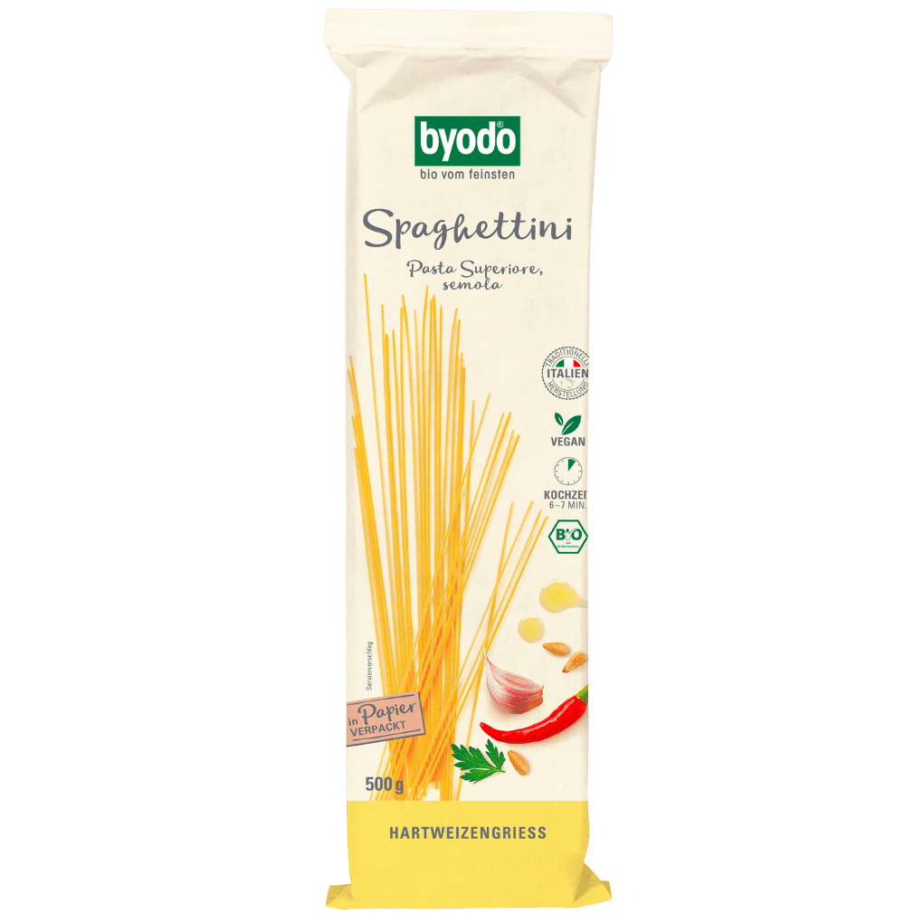 Die biologischen Spaghettini vn Byodo bieten eine extrazarte Variante zu den traditionellen Byodo Spaghetti und werden von vielen Gourmets bevorzugt, die ihre Lieblingsgerichte mit einer dünnen, feinen Nudelversion verfeinern.
