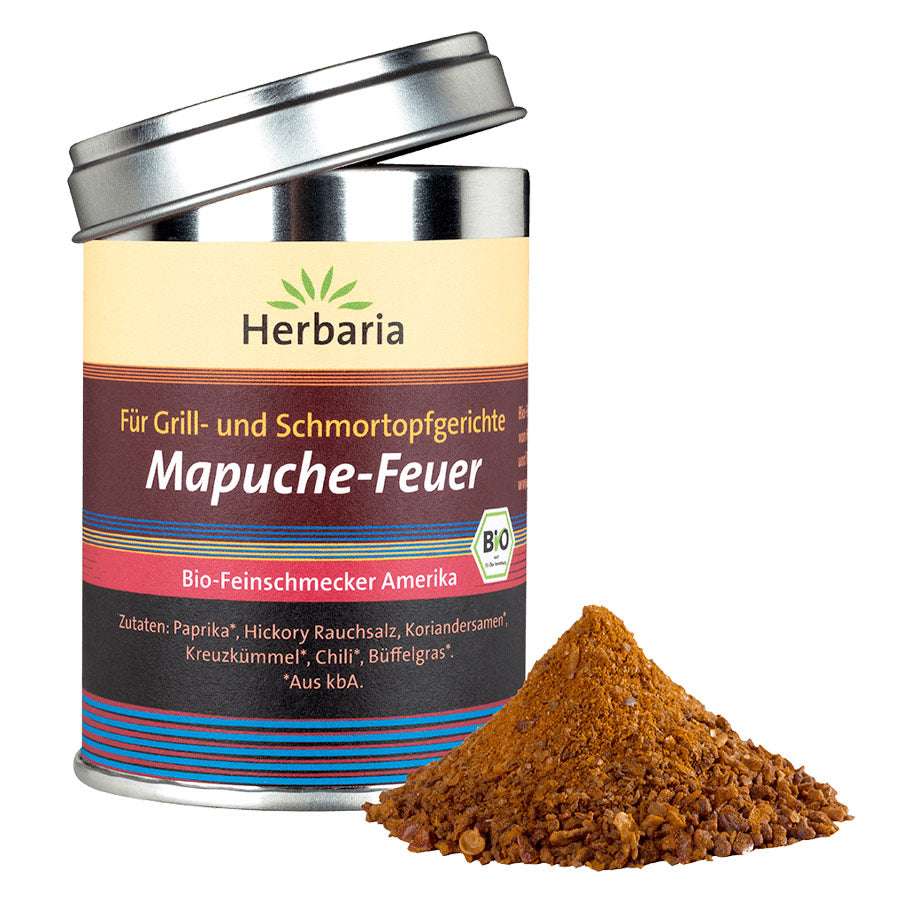 Die Herbaria Mapuche-Feuer Gewürzmischung in Bio-Qualität kombiniert rauchige, scharfe und würzige Aromen mit Zutaten wie Chili, Paprika und Pfeffer. Perfekt für Fleisch, Gemüse, Marinaden oder Eintöpfe – diese Mischung bringt südamerikanisches Feuer auf deinen Teller.