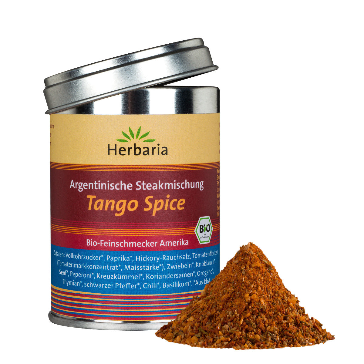 Die Herbaria "Tango Spice" Gewürzmischung vereint hochwertige Zutaten wie Vollrohrzucker, Paprika, Hickory-Rauchsalz, Tomatenflocken, Zwiebeln, Knoblauch, Senf, Peperoni, Kreuzümmel, Koriandersamen, Oregano, Thymian, schwarzer Pfeffer, Chili und Basilikum in einer ausgewogenen Mischung. Alle Zutaten stammen aus kontrolliert biologischem Anbau.