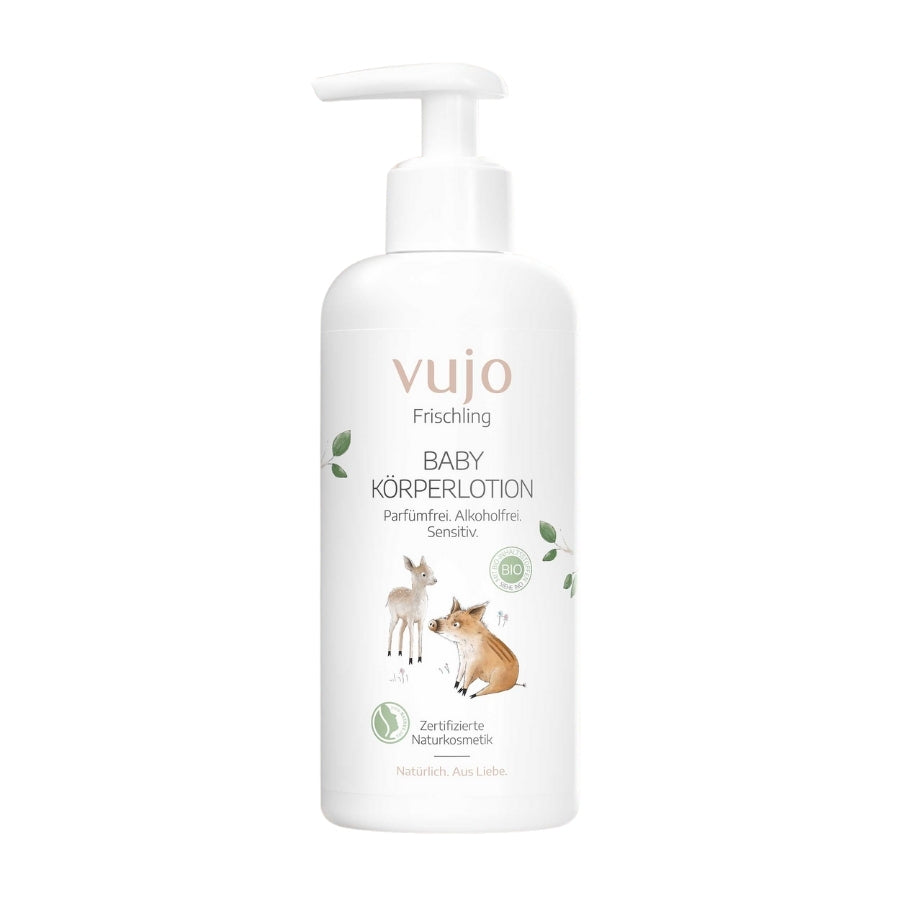 Die vujo Baby Körperlotion ist speziell für die zarte Haut von Babys formuliert und versorgt sie intensiv mit Feuchtigkeit, während sie gleichzeitig beruhigende, natürliche Inhaltsstoffe bietet.